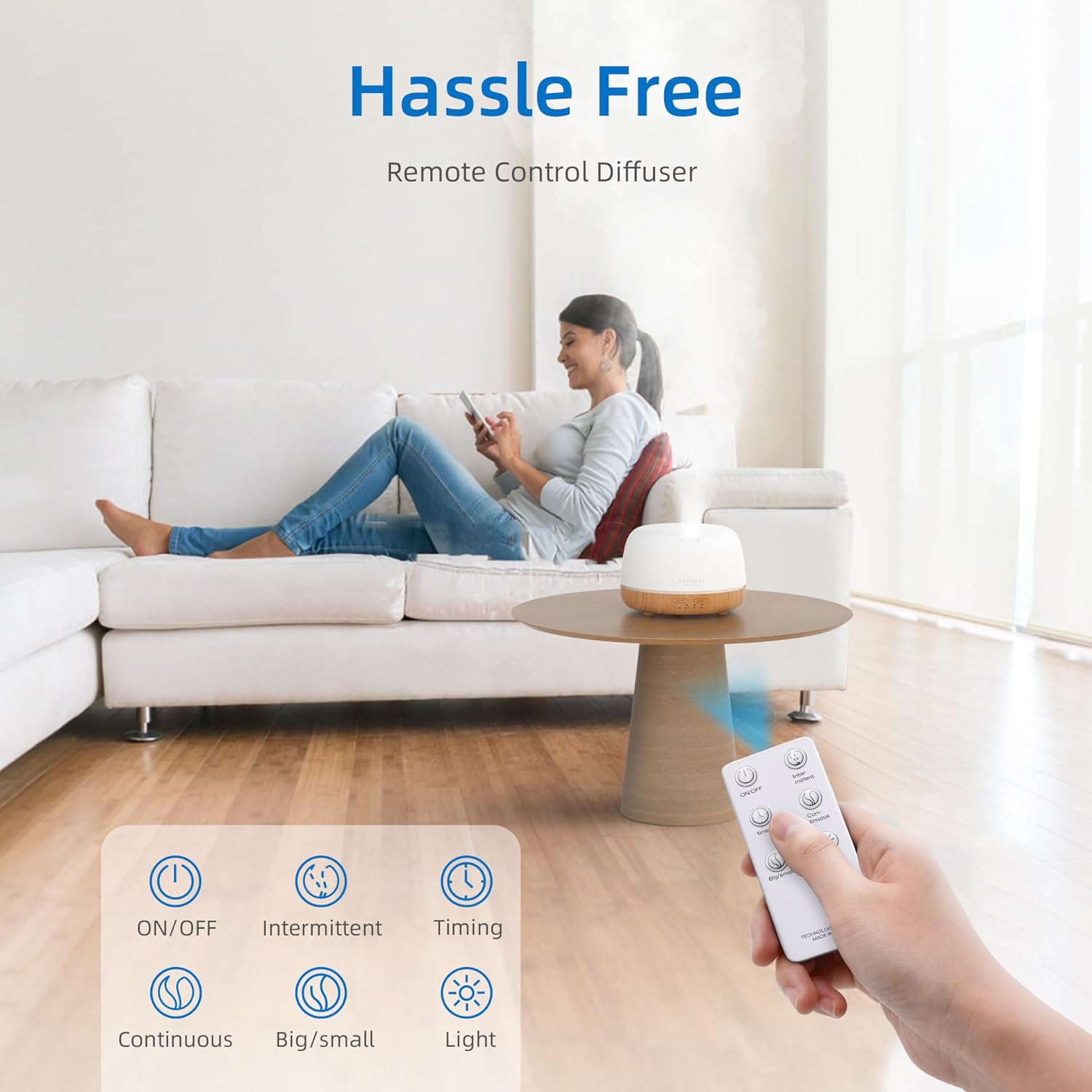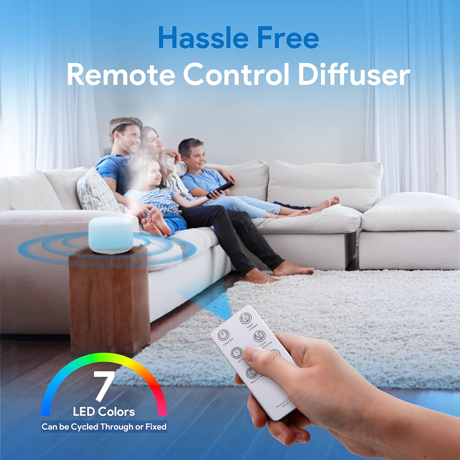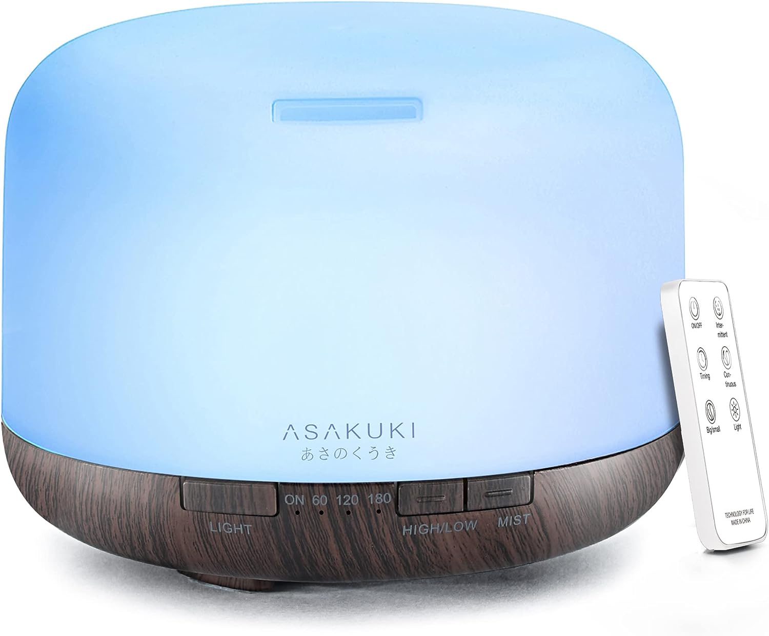 - CONVENIENT REMOTE CONTROL: Our diffuser comes with an easy to use remote control that can control it from up to 16.5-feet and change the lighting and misting modes as well as set the humidifier's timer. The LED light can be fixed or cycled through. The diffuser has 60/120/180 minute timers and steady ON mode. You can also set intermittent mist via the remote control.