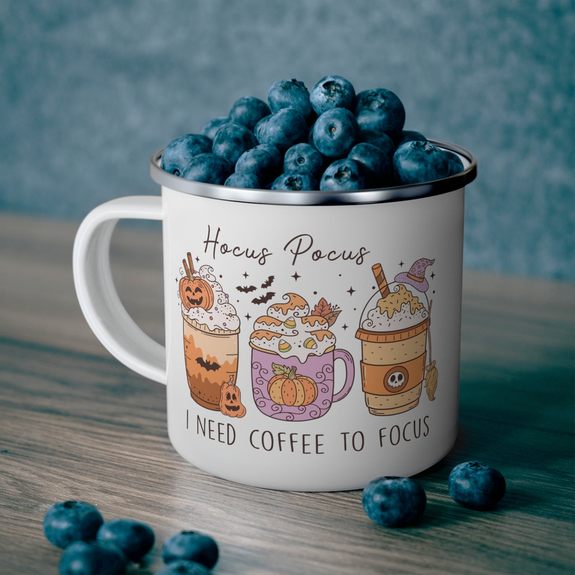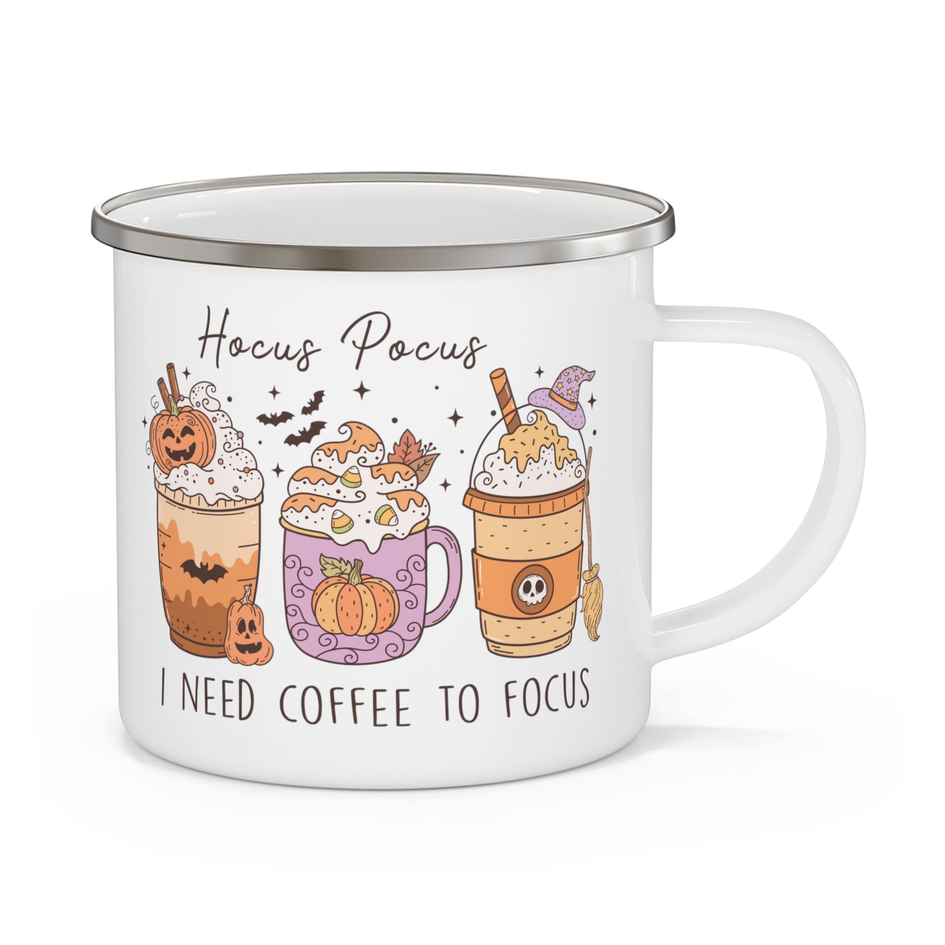 Elevate your Halloween spirit with our "I Need Coffee to Focus" Enamel Mug! This durable mug holds 12 ounces of your favorite beverage, making it ideal for your hipster moments.